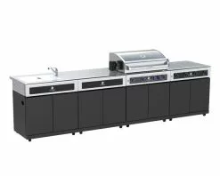 Design the ultimate outdoor kitchen and BBQ your way with Beefmasters range of add-on kitchen components; Premium Range, Bench & Sink. The Beefmaster Outdoor Kitchen suits outdoor spaces of every shape and size, each model comes in 3 different sized cooking systems: 2 Burners, 4 Burners or 6 Burners. Designed to stand alone or matched with our outdoor kitchen modules, build the perfect BBQ Kitchen for your home with Beefmaster’s unique modular customisation. This Kitchen Island is one of more than 85 possible variations of building your own customised outdoor kitchen island. If you have further inquiries call our nearest store for detailed information.