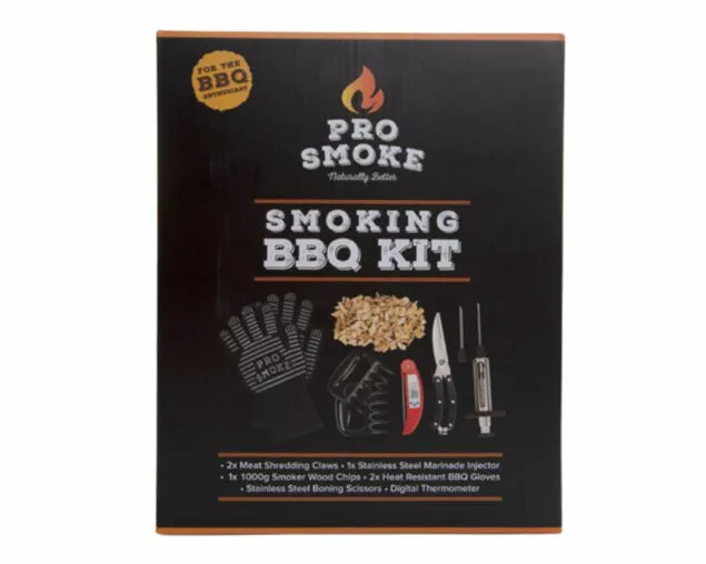 The Pro Smoke Smoking Set has everything you need to become a pro smoker. Includes 2 x Heat resistance gloves, XL stainless steel marinade injector, meat shears, 1kg smoking chips and meat claws.