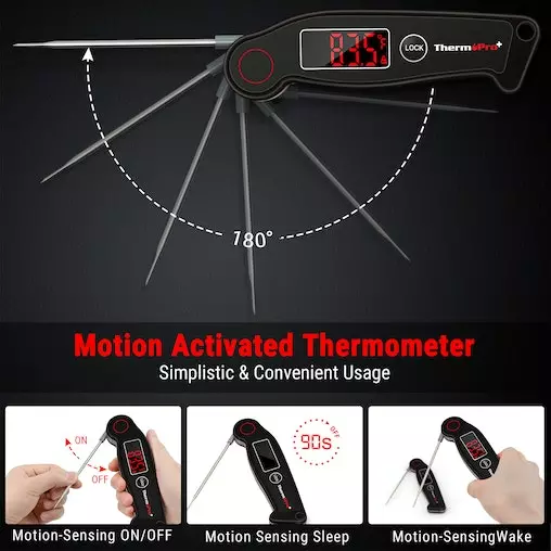 Motion sensing On/Off/Wake/Sleep & Lock function: Grill thermometer is always ready when you are, engineered with advanced motion sensing technology which powers on the probe thermometer when the probe is withdrawn, powers off when retracted, sleeps when set down for 90s and instantly wakes up when picked up