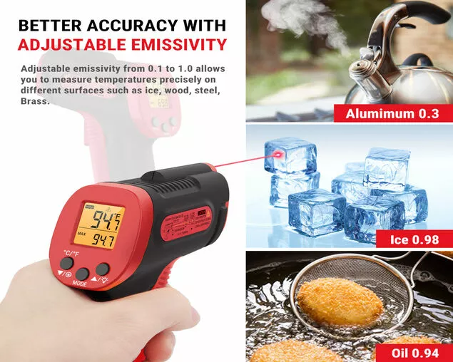 provide the highest accuracy up to ±1.5%; Improve the accuracy of the IR thermometer gun by adjusting the emissivity